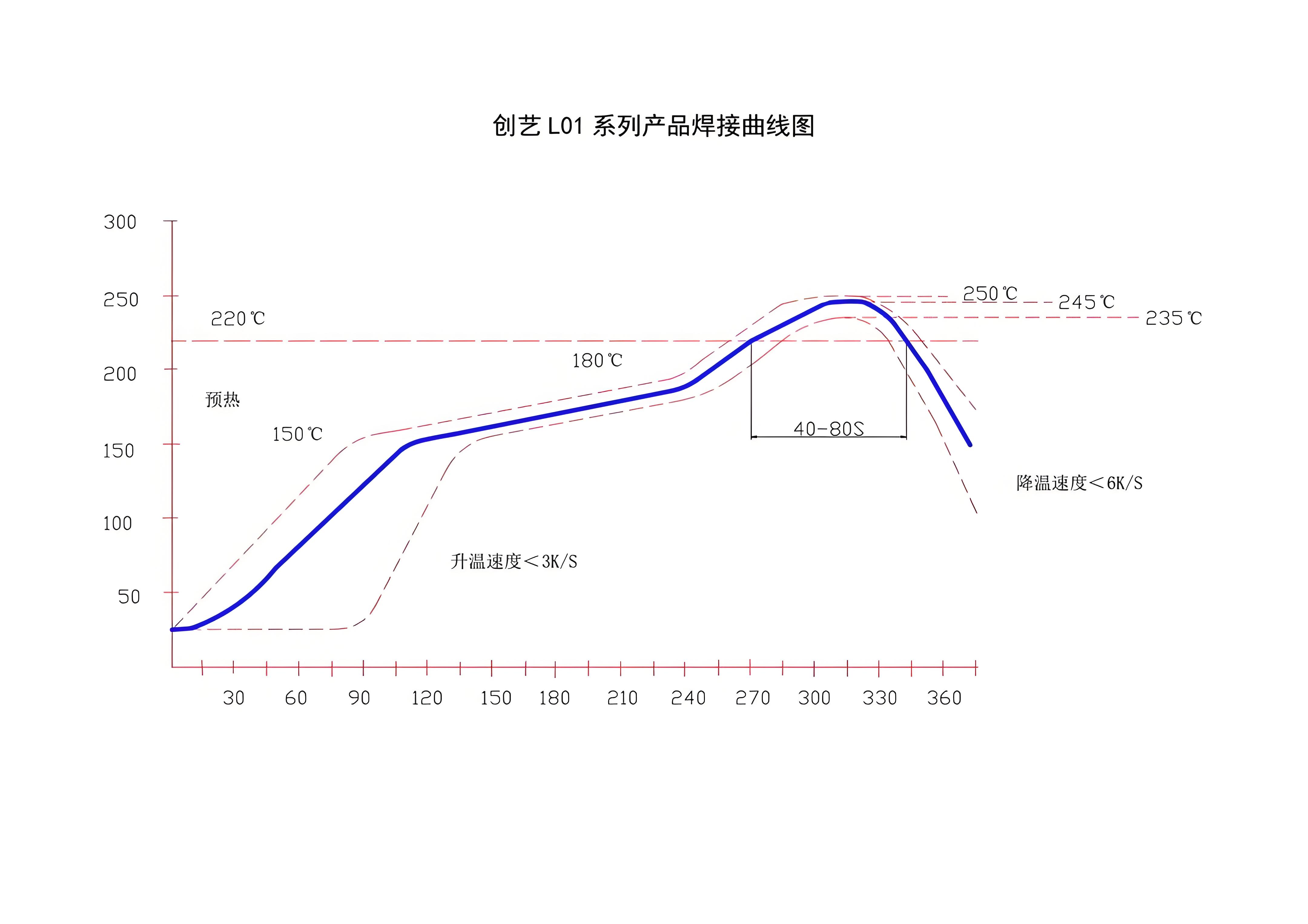1、本產品適用于回流焊接工藝。回流焊接預熱區(qū)工藝指引:預熱時間80-150秒。(1、有鉛錫膏,室溫至130℃,升溫速度2.5℃/秒以下。2、無鉛錫膏,室溫至130℃,升溫速度1-3℃/秒。)由于各用戶具體應用所要加工的組件在規(guī)格、構造、精度及焊接機器和焊劑都不盡相同,所以我們建議用戶在正式焊接之前首先進行試驗以確保產品及生產工藝的高度契合。由于進行回流焊接的具體溫度和時間會有所差異,接線端子可能會產生一定的顏色偏差。但是不會影響接線端子的使用功能。
